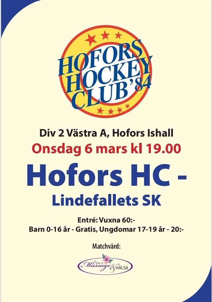 Efter två besvikelser i form av förluster är det dags att rädda andraplatsen i kvalserien vilket kan visa sig vara väldigt viktigt i slutändan. Vi har revansch att fordra på Lindefallet och det är dags att ta den i morgondagens hemmamatch. Vi behöver rädda äran och avsluta på bästa sätt. Killarna behöver stöd från läktarna så kom till Hofors ishall på onsdag och ge laget ditt stöd! Matchen börjar 19.00 och dörrarna öppnar kl. 18. Vi vill rikta ett stort tack till Eva´s massage och hälsa som är matchvärd och delar ut pris till bästa hemmaspelare. Varmt välkomna till Hofors ishall på onsdag! Hofors HC 5 mar 2024 0kommentarer