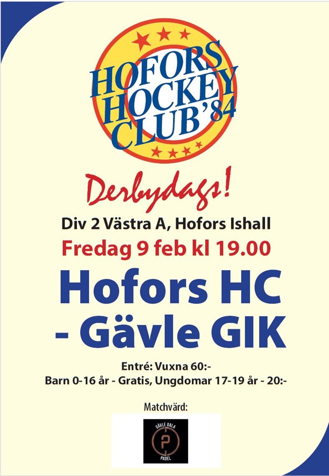 Efter en riktig värdemätare mot Valbo HC i fredags är det dags för ett nytt hett Gästrikederby. Dags att plocka hem tre poäng med vårt nybyggda lag mot GGIK som parkerar precis framför oss i tabellen. Killarna i laget är laddade efter en veckas träning och finslipning av taktik och vi hoppas ni i publiken är lika taggade. På fredag kväll är det dags hemma i Hofors ishall. Cafeterian är öppen som vanligt med allt fredagsgodis du kan tänkas behöva, chokladhjulet rullar och vi kör puckkastning i andra periodpausen. Kom ner och stötta grabbarna när vi finslipar laget inför det stundande kvalet för att behålla vår division 2 status. Vi visar också upp vår fina ungdomsverksamhet med två ungdomsspelare som får lägga straff på respektive lags målvakt innan nedsläpp. Matchvärd är Gävle Dala Padel som delar ut pris till bästa hemmaspelare i Hofors HC. Stort tack till dem! Dörrarna öppnar 18.00 och pucken släpps 19.00. Varmt välkomna! Hofors HC 7 feb 2024 0kommentarer
