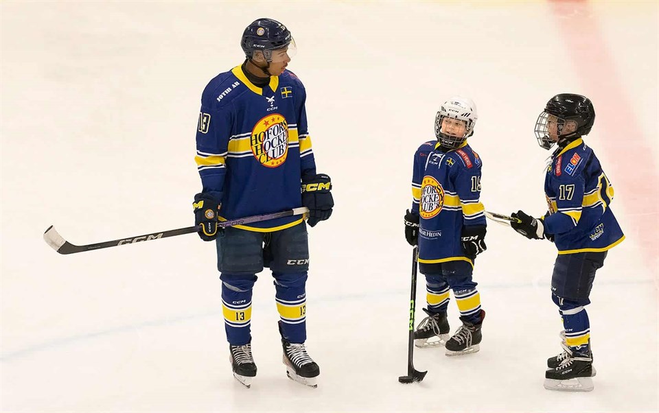 Våra Mini-Steelers som lade straff innan matchen igår var # 17 Milton Andersson och # 19 Kian Strand. Milton Andersson är född 2017 och spelar ishockey i Hofors HC Team 17/18. När han blir stor vill han spela ishockey i Brynäs IF. Hans stora idoler är Bobby Trivigno och Damien Clara. Kian Strand är född 2018 och spelar också han ishockey i Hofors HC Team 17/18. När han blir stor vill Kian spela ishockey i Brynäs IF eller i Hofors HC. Hans stora idol är pappa Mattias Strand som också är tränare för Team 17/18. Foto: Lars-Göran Abrahamsson
