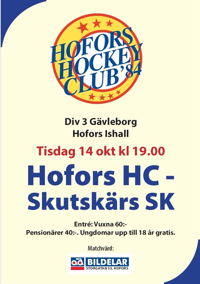 På tisdag ställs vi mot Skutskär i den andra hemmamatchen för säsongen. Ett Skutskär med en Hoforskändis i laget - Kevin Lilja - så här gäller det att visa var skåpet ska stå. Vi möter ett mycket starkare Skutskär än förra året och ett lag som går för en play off plats i vår. Skutskär vann stort i första omgången mot Ockelbos B-lag och det är svårt att göra någon bedömning om lagets styrka utifrån det. Vi laddar upp till hockeyfest som vanligt såklart. Cafeterian är bemannad med alla solstrålar redo att hjälpa dig med allt du kan behöva få i magen både före och under match. Vi bjuder på Ministeelers, chokladhjul, puckkastning och chans att gissa första målgörare i hemmalaget som vanligt. Varmt välkomna till en spännande tisdag i hockeyns tecken. Vi säger stort tack till Anders och AD Bildelar som är matchvärd och delar ut pris till bästa hemma- och bortaspelare. Dörrarna öppnar 18 och pucken släpps 19.00