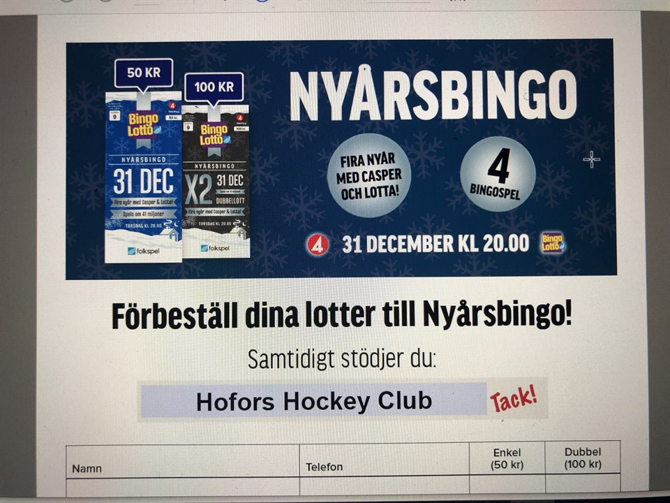 Dags att spela Bingolotto på nyår? Köp era lotter via Hofors Hockey Club Skicka ett sms till 0734407185 med besked om hur många lotter man vill ha och till vilken adress de ska levereras till för en smittsäker överlämning i postlådan. Betalning sker också till samma nummer. 50 kr per enkellott Tack för ert stöd!
