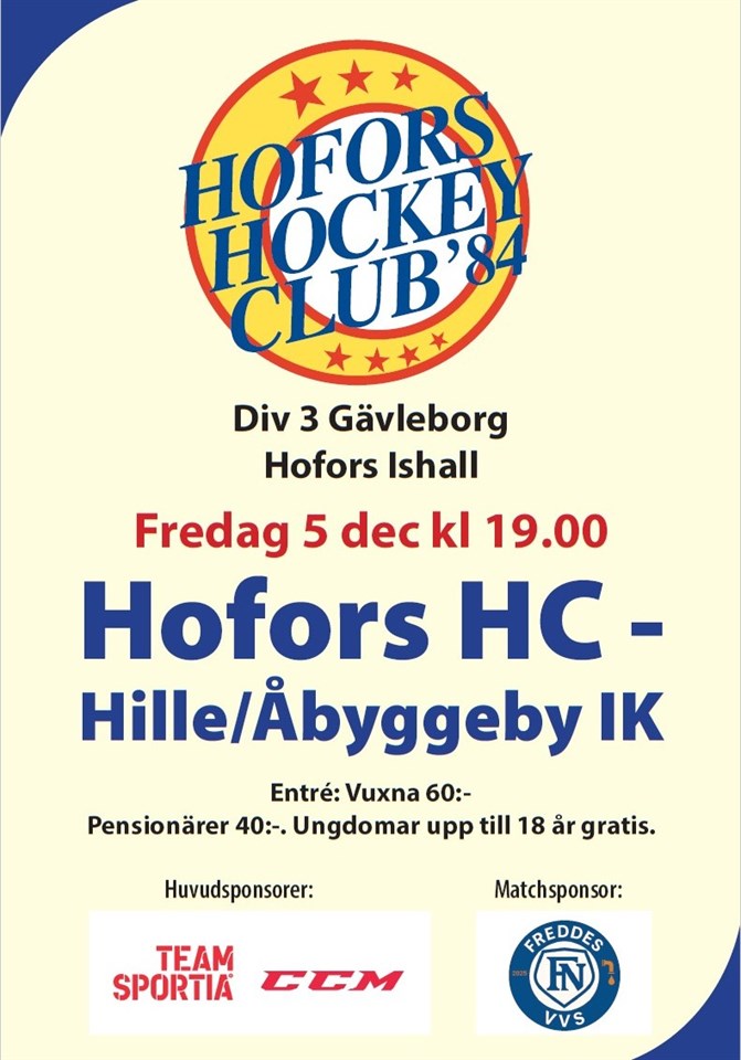 På fredag möter vi ett riktigt formstarkt Hille/ÅIK IK som gått fram som en ångvält på slutet..Efter en svag start på seriespelet har Hille/ÅIK fått ordning på spelet och slagit bl.a. Bollnäs på bortaplan. Det är ett rutinerat och starkt lag som vi möter hemma på fredag med spelare som Joakim Silfverberg, Freddie Stömne och Viktor Strand i laget. Det bådar gott för en spännande och tuff match. Det kommer krävas en maxprestation med hårt jobb och en riktigt bra insats från hemmalaget för att poängen ska stanna hemma i Hofors. Vi laddar för en riktig hockeyfest hemma i Hofors ishall denna fredag och vi hoppas att ni kommer till ishallen och ger killarna allt det stöd de kan få. Vi fortsätter presentera våra Mini-Steelers, kör puckkastning och chokladhjul. Cafeterian är som vanligt laddad med allt du kan behöva för en helväll med hockey. Matchvärd är Freddes VVS i Järbo och vi är tacksamma och stolta över samarbetet! Dörrarna öppnar kl. 18.00 och pucken släpps 19.00 Varmt välkomna!